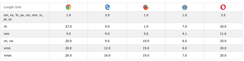 Các đơn vị đo được hỗ trợ trong từng phiên bản của trình duyệt, trích từ w3school: