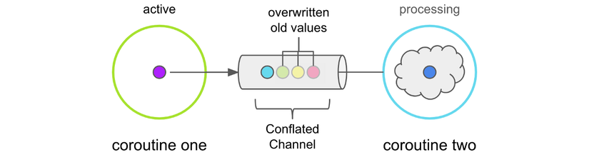 Conflated channel Là 1 buffered channel nhưng capacity chỉ bằng 1. Thằng này khác thằng bufferd channel ở chỗ mặc dù chỉ có capacity = 1 nhưng khi full nó ko suspend thằng coroutine sender mà cho phép thằng sender tiếp tục send value, giá trị mới nhất sẽ overwrite lên giá trị cũ. Tức là lúc nào trong channel cũng chỉ có tối đa 1 giá trị mà thôi.