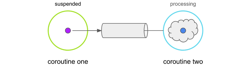 Nhìn hình có thể thấy coroutine one nó đang có 1 data nhưng lại bị suspend, ko thể send qua channel vì coroutine two còn đang bận xử lý. Cái ống đó tượng trưng cho channel.
