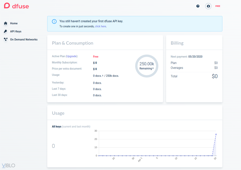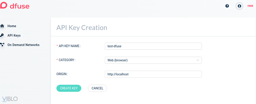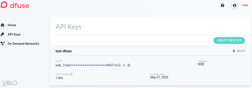 Truy cập https://app.dfuse.io/keys --> chọn "CREATE NEW KEY"