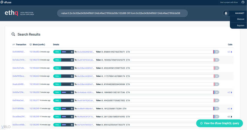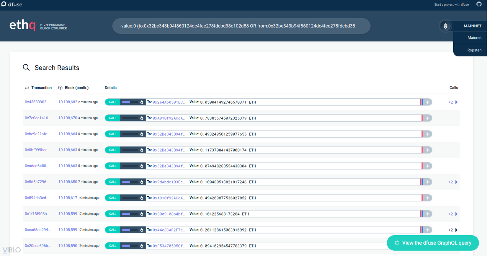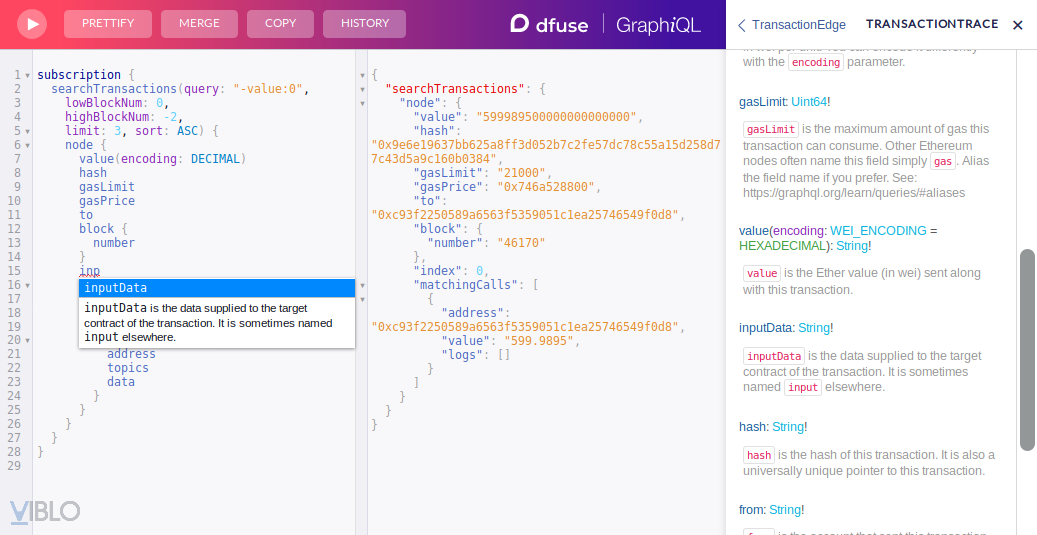 Các truy vấn tìm kiếm (hoặc stream data thông qua subscription GraphQL hay paginated phân trang thông qua GraphQL query) thì được xây dựng bằng dfuse Search Query Language. Hãy xem tài liệu tại Ethereum Search Terms Reference để biết danh sách đầy đủ các thuật ngữ sẽ được chấp nhận.