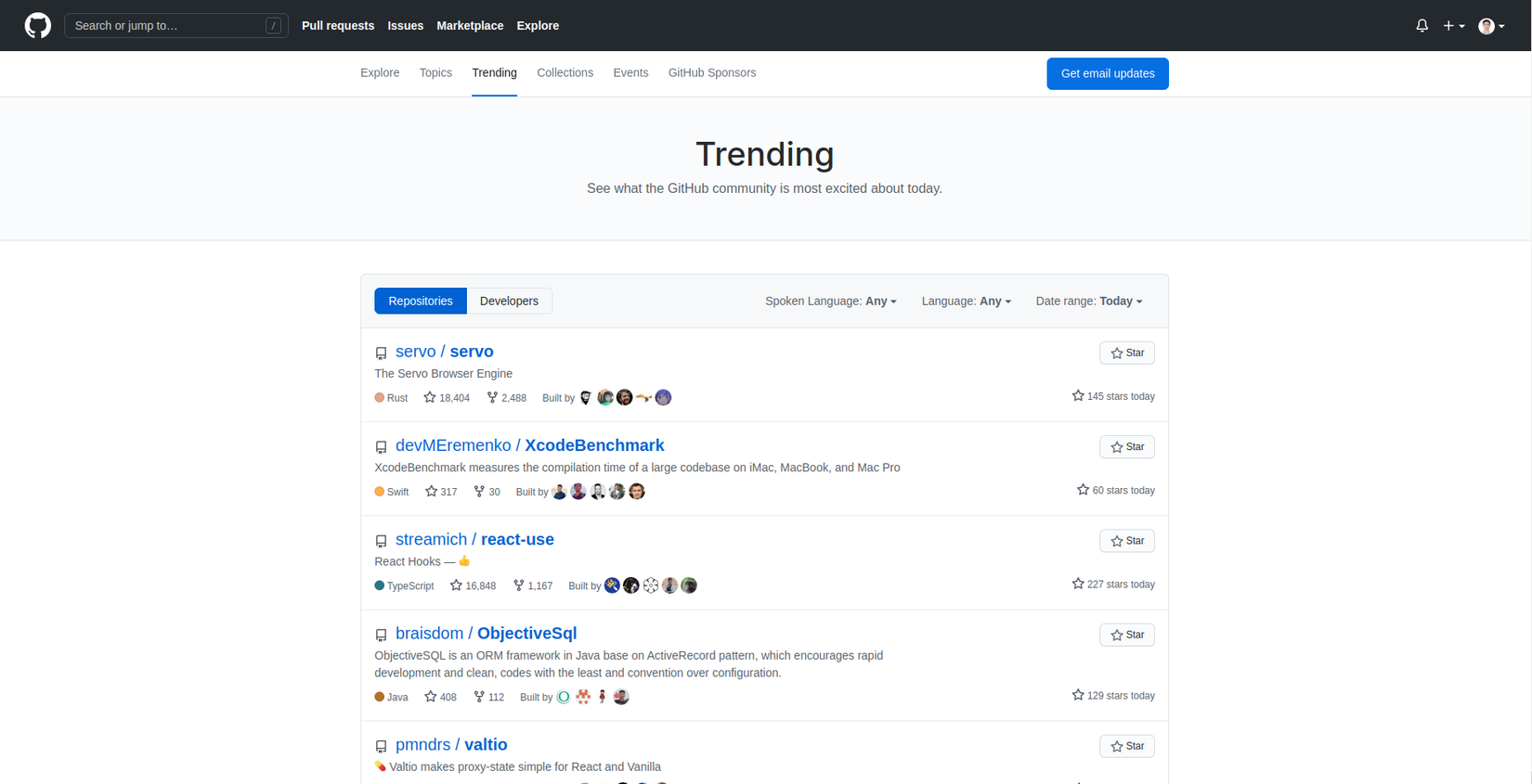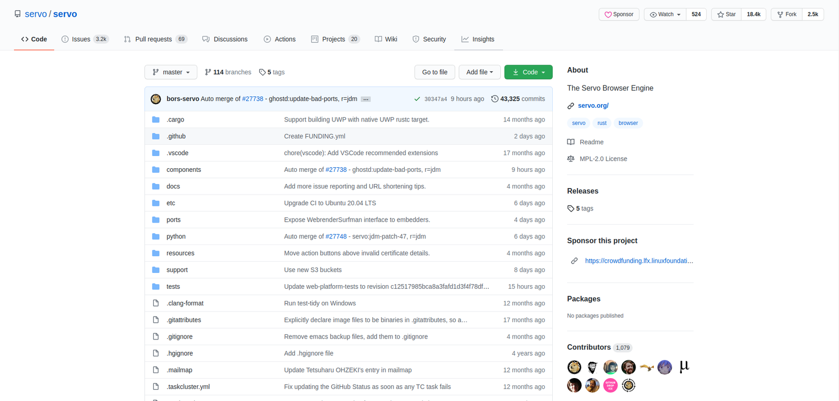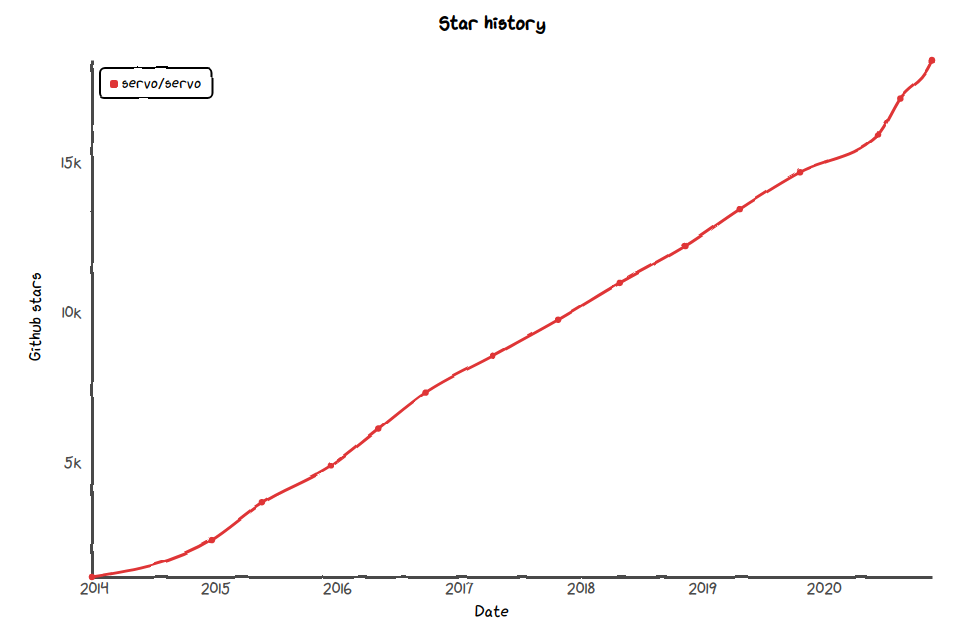 Được khởi tạo từ năm 2014, lượng star của servo khá tăng khá ổn định trong 6 năm qua và hiện nay đã đạt mức 18,000 stars. Bên cạnh đó, repo này có 43,325 lượt commits và nhận được xấp xỉ 2,500 lần lượt fork từ cộng đồng. Có thể nói rằng Rust là một trong những ngôn ngữ mạnh mẽ trong thời điểm hiện nay, và tất nhiên các thư viện của nó cũng sẽ nhận được sự quan tâm của cộng đồng.