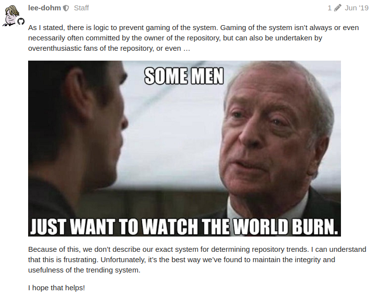 Vậy để có được danh sách như trên, GitHub dựa trên tiêu chí nào để lọc ra những dự án đang được quan tâm nhất trong hàng triệu dự án đang công bố mã nguồn trên nền tảng của nó. Tiêu chí đầu tiên có thể dễ dàng nhận ra nhất là tổng số stars (thứ tương đương với lượng like trên Facebook hoặc up vote trên Reddit) trong khoảng thời gian đã chọn. Tuy nhiên vẫn có một số repo nhận được số stars tương đương nhưng lại không được đề cập trong danh sách này. Vậy nên, tổng số stars không phải là tiêu chí duy nhất được áp dụng mà bên cạnh nó có thể là số lượt được xem, số lượt fork, và quan trọng nhất là chất lượng cũng như ý tưởng và lợi ích mà nó mang đến cho cộng đồng. Dù sao đi nữa những tiêu chí trên cũng là phỏng đoán vì phía GitHub cũng không công bố tiêu chuẩn của họ và tất nhiên, mặc dù khuyến khích việc khám phá cũng đóng góp cho vô vàn dự án mã nguồn mở có trên hệ thống của mình, ban vận hành hệ thống GitHub không mong muốn nơi này trở thành chỗ chỉ để mọi người đua trending.