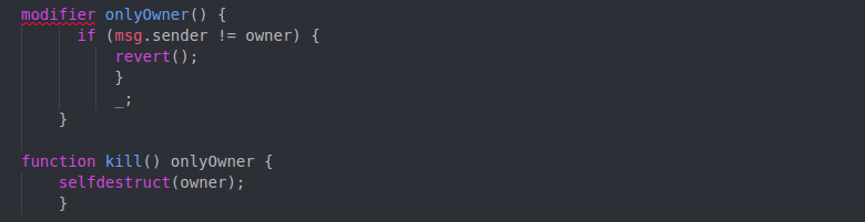 Lưu ý: Ta hoàn toàn có thể viết trực tiếp điều kiện ở hàm kill() nhưng việc sử dụng modifier sẽ tiện cho việc dùng những lần gọi sau để giảm sự dư thừa của các đoạn code. Tuy nhiên, việc sử dụng chúng lại phải thực hiện một cách cẩn trọng.