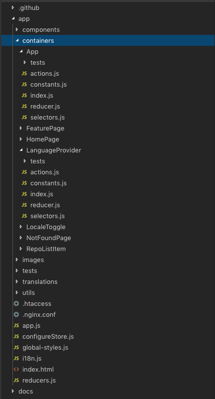 Trong app thì chúng ta sẽ chú ý tới 2 folder chính đó là Components và Containers. Đúng như tên gọi thì Component là nơi chứa các component chỉ đơn giản với mục đích là hiển thị ra View, còn Container là nơi giao tiếp với Store nên trong mỗi folder con của Containers sẽ có thêm các file liên quan như là actions, reducer, selector.