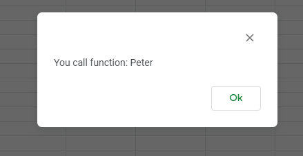 SpreadsheetApp.getUi().alert('You call function: Peter');