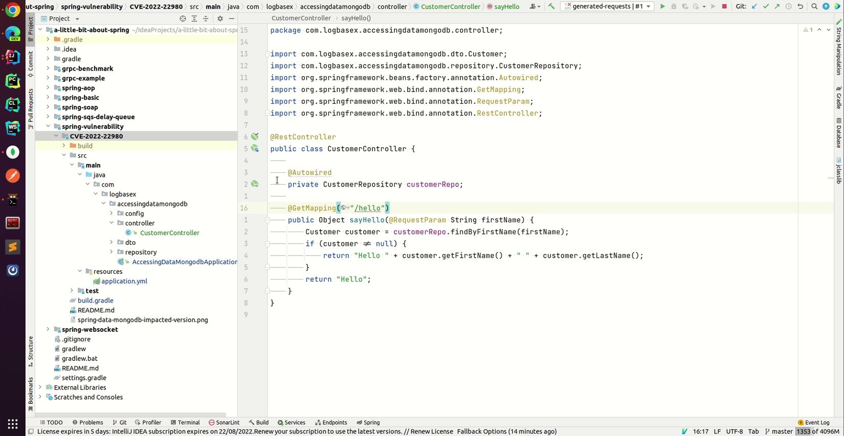 CVE-2022-22980 là một lỗ hổng bảo mật của thư viện spring-data-mongodb có thể khiến attacker chạy bất kì câu lệnh nào trên máy chủ bằng việc truyền một đoạn mã độc vào user input để trigger thư viện thực thi nếu như ứng dụng Spring Boot + MongoDB sử dụng JSON based query methods với @Query, @Aggregation annotaion có chứa parameter expression SpEL - Spring Expression Language tương tự như sau: