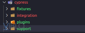 fixtues: Đây là folder chứa những dữ liệu tĩnh để sử dụng trong quá trình chạy test.integration: Folder chứa file test. Test file có thể sẽ là file dạng:.js,.jsx,.coffee,.cjsx.plugins: Với mỗi lần chạy file spec, thì plugins trongplugins/index.jssẽ được chạy. Bạn sẽ không phải import vào tất cả những file spec test của mìnhsupport: Về cách chạy thì nó cũng nhưng plugins, nhưng mục đích sử dụng thì khác nhau. Những file support sẽ chứa những thao tác lặp đi lặp lại như command.