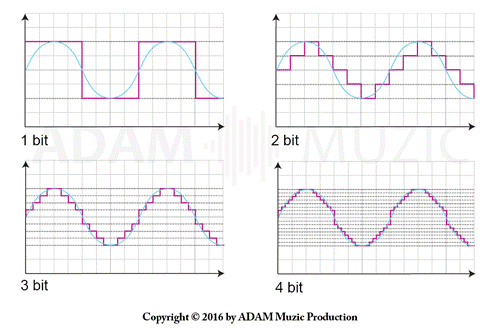 - Bit depth: thể hiện độ phân giải âm thanh tức là khoàng cách giữa điểm âm cao nhất và thấp nhất được số hóa là bao nhiêu. Phổ biến bit depth = 16 bits. VD: