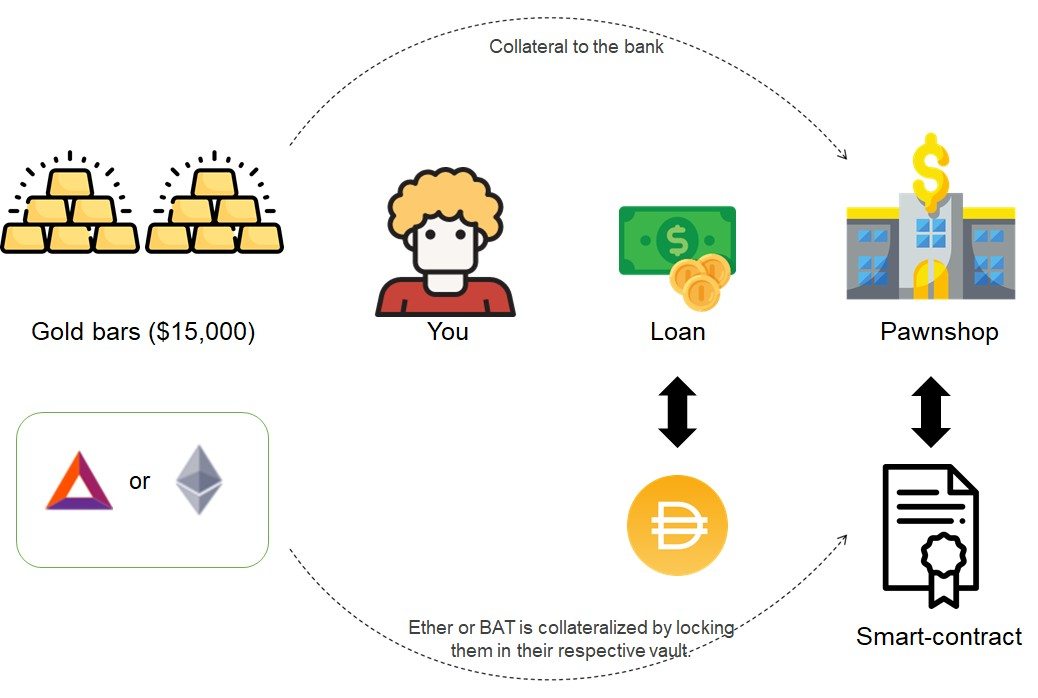 Vậy nên, khi muốn nhận hoặc vay DAI từ nền tảng Maker, chúng ta sẽ thế chấp ETH, BAT, .... (trong danh sách tài sản chấp nhận thế chấp) vào nền tảng. Khi muốn đổi lại tài sản thế chấp thì chỉ cần trả lại lượng DAI đã nhận cùng 1 ít phí ổn định (Stability Fee)