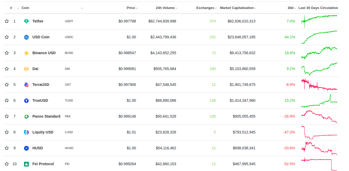 Ảnh dưới là top 10 các stablecoin tại thời điểm giữa tháng 6 theo trang thống kê CoinGeckgo