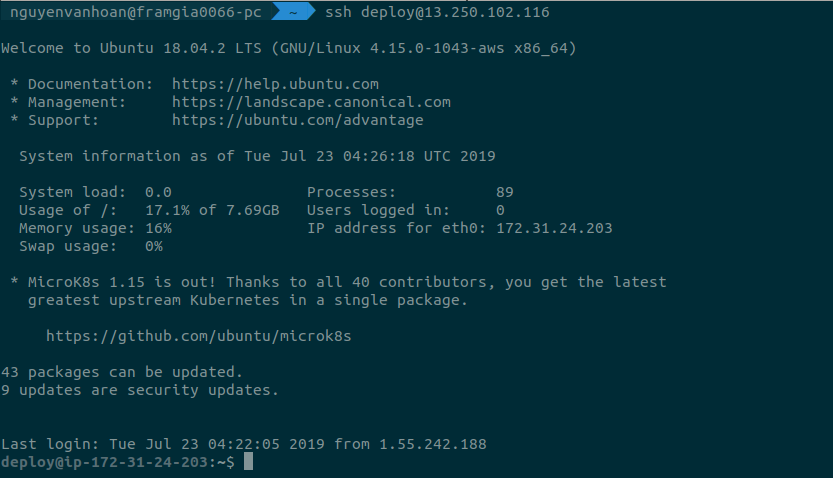 truy cậpserver vớiaccount user deploy, cònuser ubuntuthì chỉ có bạn thôi, vì bạn làbig bossmà