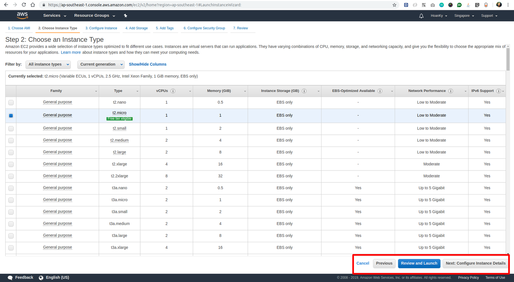 Instance Type,- Tương ứng sẽ chọn CPU, RAM ... nhưng ở đây chỉ có 1 loại được sử dụng cho "Free tier eligible" thôi.