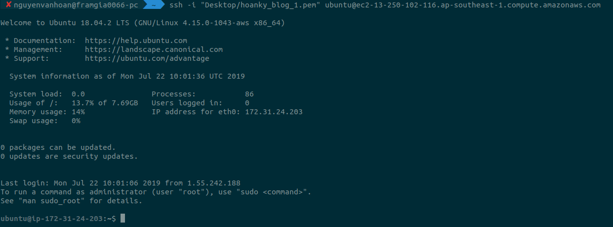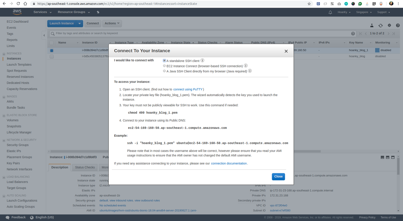 ssh -i "hoanky_blog_1.pem" ubuntu@ec2-13-250-102-116.ap-southeast-1.compute.amazonaws.com