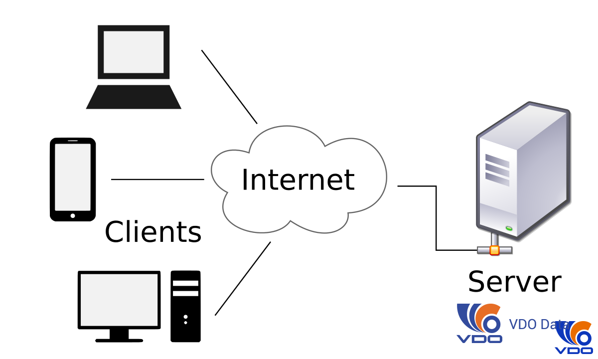 Người yêu, hay bạn bè hay thầy cô của bạn có thể dùng laptop, điện thoại hoặc PC (ở bên trái), thông qua mạng interet để tiếp cận với server (ở bên phải - nơi bạn đặt ứng dụng của bạn làm ra).