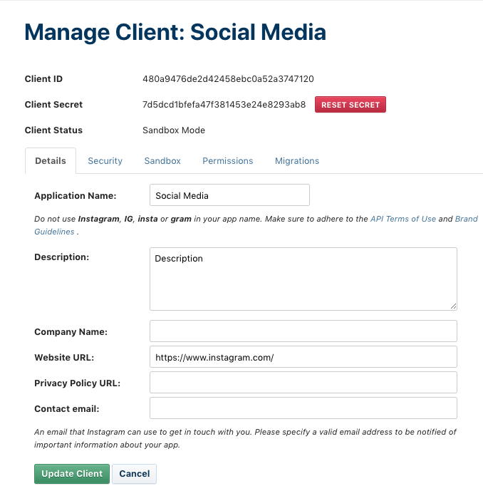 Chúng ta thấy hiện tại ứng dụng đang ở trạng thái sandbox, khi chúng ta develop thì chỉ cần như này là đủ, tuy nhiên để app có thể public và sử dụng đầy đủ các API của Instagram thì buộc chúng ta phải cung cấp các thông tin và submit để Instagram review. Các bạn có thể tap vào MANAGE để vào chỉnh sửa các thông tin