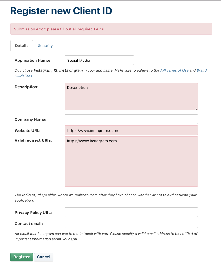 Rồi, giờ chúng ta sẽ thấy giao diện để đăng ký một Client ID, chúng ta cần điền vào các trường bắt buộc, trong đó chú ý một chút về Valid redirect URIs nó được mô tả "The redirecturi specifies where we redirect users after they have chosen whether or not to authenticate your application." ở đây mình chọn luôn đến trang chủ Instagram