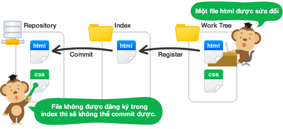 Giữa repository và working tree tồn tại một nơi gọi là index. Index là nơi để chuẩn bị cho việc commit lên repository.