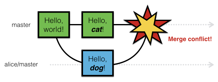Conflict là trường hợp ở cùng 1 hay nhiều dòng code trên một file nhưng lại có 2 hoặc nhiều sự thay đổi khác nhau. Nên khi merge, git không biết nên chọn merge mã nguồn nào nên sẽ báo conflict. Ví dụ: Trên file A, có member X và Y cùng thao tác nhưng trên 2 nhánh khác nhau. Tại dòng 1 đến 10 của file A, member X thì viết "Hello, cat!", member Y thì viết "Hello, dog!". Khi member X merge code từ nhánh của member Y về, thì Git không biết nên lấy "Hello, cat!" (của member X) hay "Hello, dog!" (của member Y) là đúng nên dẫn đến việc conflict.
