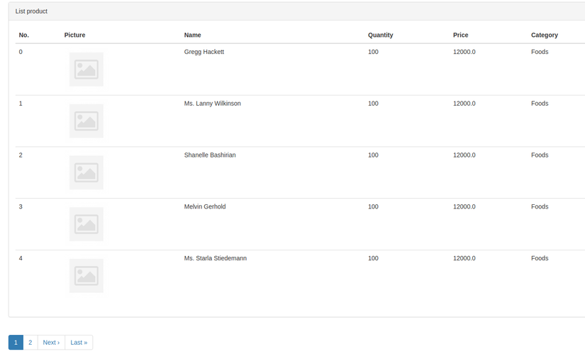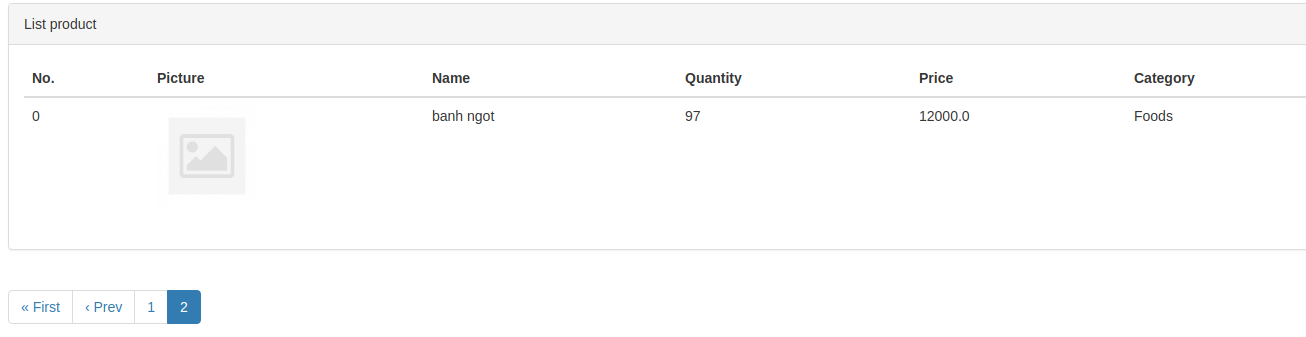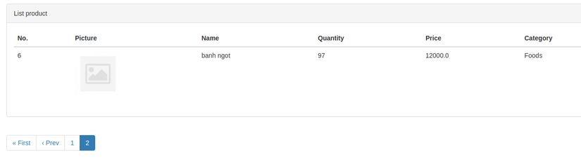 Tiếp theo ta tạo dữ liệu với 1 model product với các trường dữ liệu là picture, name, quantity, price và category rồi thêm 6 bản ghi.