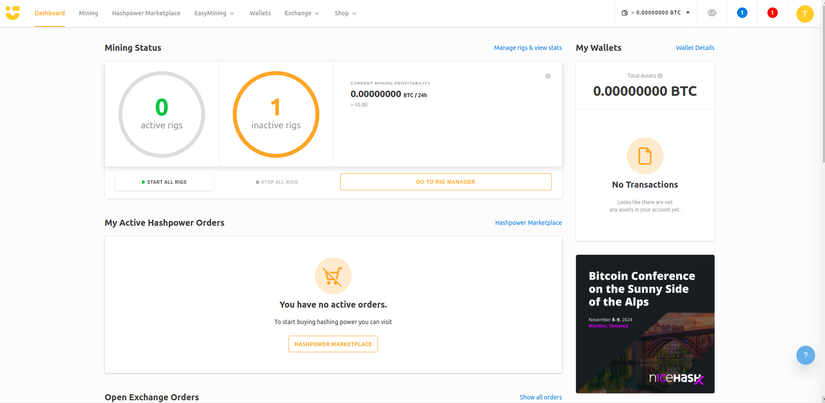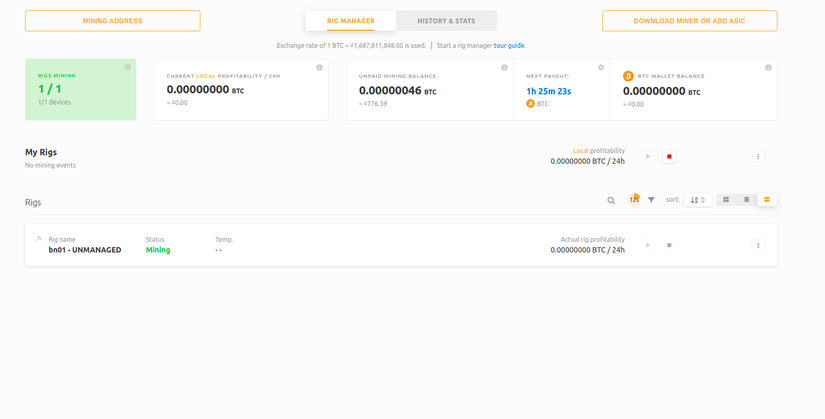 Sau khi đăng ký tài khoàn và xác minh xong, trong màn hình dashboard bạn sẽ thấy thông tin về số dư tài khoản và thông tin các rig (giàn khoan), các giàn khoan đang hoạt động và các giàn khoan đang tắt.