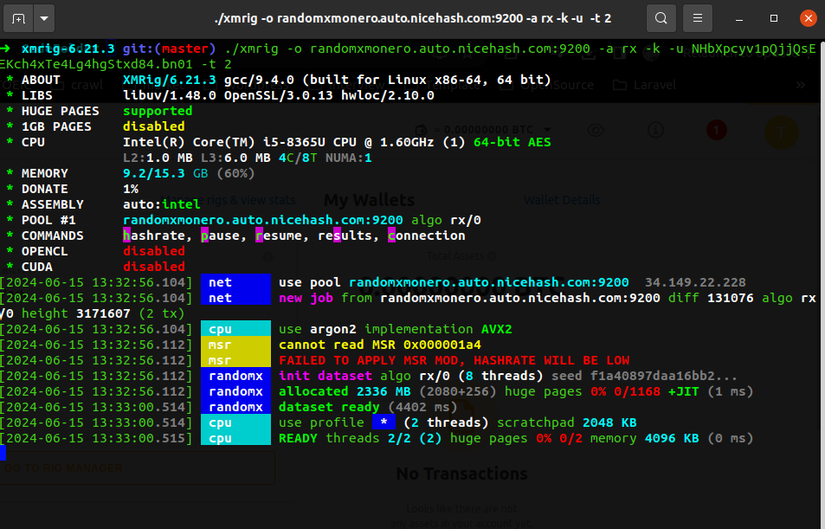 ./xmrig -o randomxmonero.auto.nicehash.com:9200 -a rx -k -u <address_wallet>.bn01 -t 2