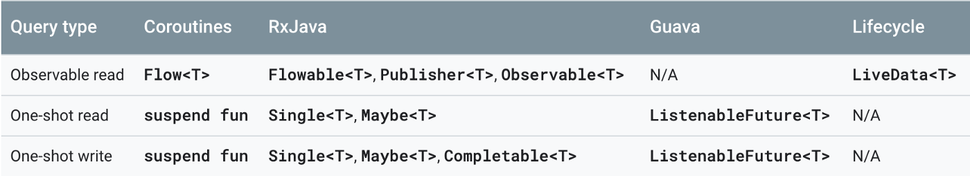 Bạn có thể trả về LiveData, Observable và Flow từ các phương thức truy vấn. Ngoài ra, bạn có thể thực hiện chức năng tạm ngưng phương pháp DAO. Những điều này được thảo luận trong các bài riêng biệt.