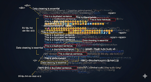 Trong thực tế, 70–80% lỗi của mô hình đến từ dữ liệu “bẩn”, không phải từ bản thân thuật toán. Tập dữ liệu chưa xử lý thường bao gồm văn bản copy từ web, HTML dư thừa, emoji, ký tự mã hóa sai chuẩn Unicode và thông tin trùng lặp. Khi đưa trực tiếp vào huấn luyện, mô hình sẽ học cả những thành phần không mong muốn, dẫn tới kết quả suy luận lệch ngữ cảnh.