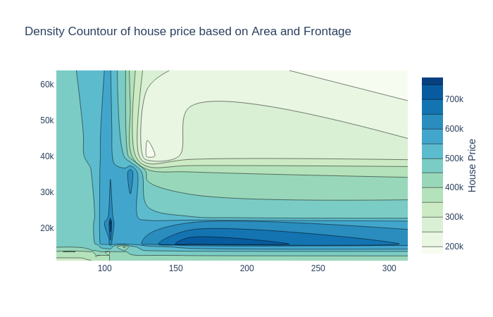 fig.update_layout(title="Density Countour of house price based on Area and Frontage")