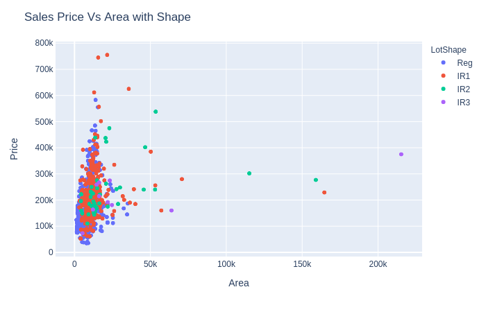 fig.update_layout(title='Sales Price Vs Area with Shape',xaxis_title="Area",yaxis_title="Price")