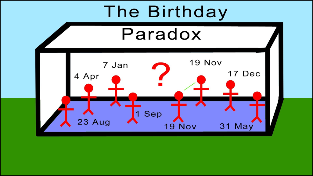 Tuy nhiên, nghịch lý ở đây là, nếu bạn tập hợp 20-30 người trong 1 phòng thì tỉ lệ hai người có cùng ngày sinh nhật sẽ tăng lên nhanh chóng. Trên thực tế thì có cơ hội 50-50 cho 2 người có cùng ngày sinh trong kịch bản này!