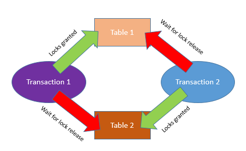 Ví dụ như hình ảnh trên: Transaction 1 đang Lock tài nguyên ở Table 1, và cần tài nguyên ở Table 2 xử lý tiếp để kết thúc và release Lock tài nguyên Table 1. Đồng thời, Transaction 2 lại đang Lock tài nguyên ở Table 2, và cần tài nguyên ở Table 1 để xử lý và release Lock. Một vòng tròn đợi chờ xuất hiện, lúc này MYSQL sẽ phải kill 1 Transaction để release Lock mà Transaction đó đang nắm giữ, Transaction còn lại được cấp tài nguyên xử dụng đầy đủ và thực hiện thành công (COMMIT hoặc ROLLBACK).