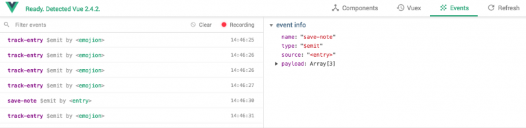 Chức năng này cho phép bạn tracking những event trong ứng dụng, nhưng nó chỉ hiển thị những custom event. Ví dụ event mà bạn tự emit với this.$emit(‘myEvent’) , chứ ko phải những native event như là on:click, on:keyup,…