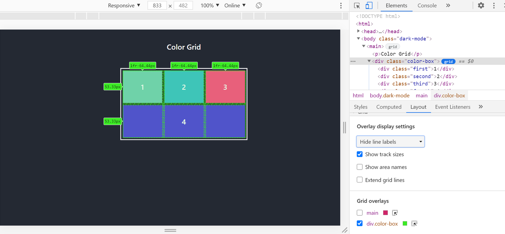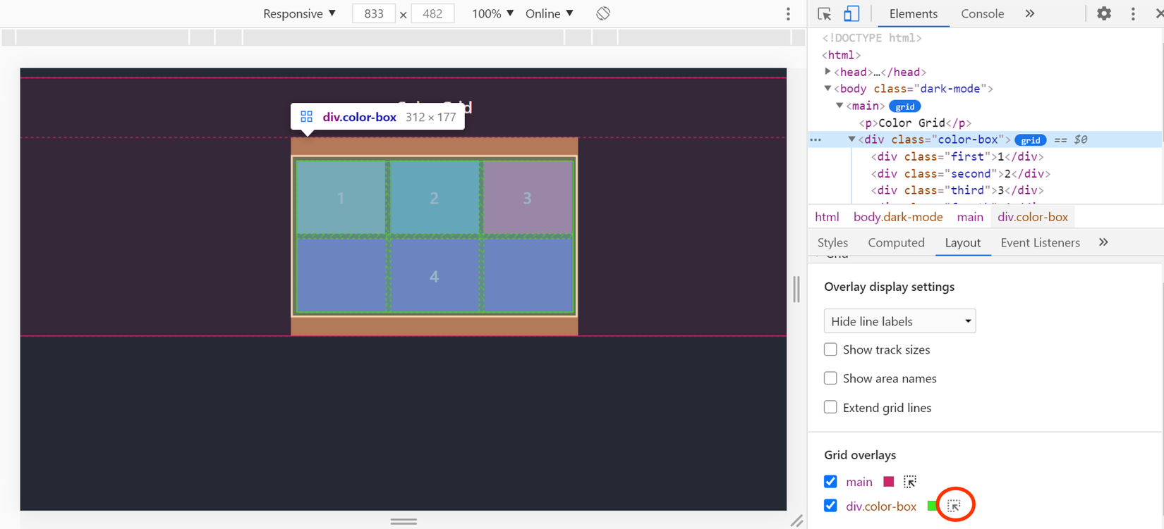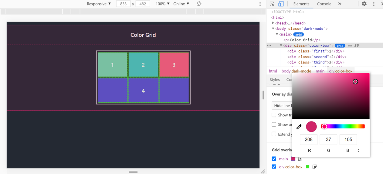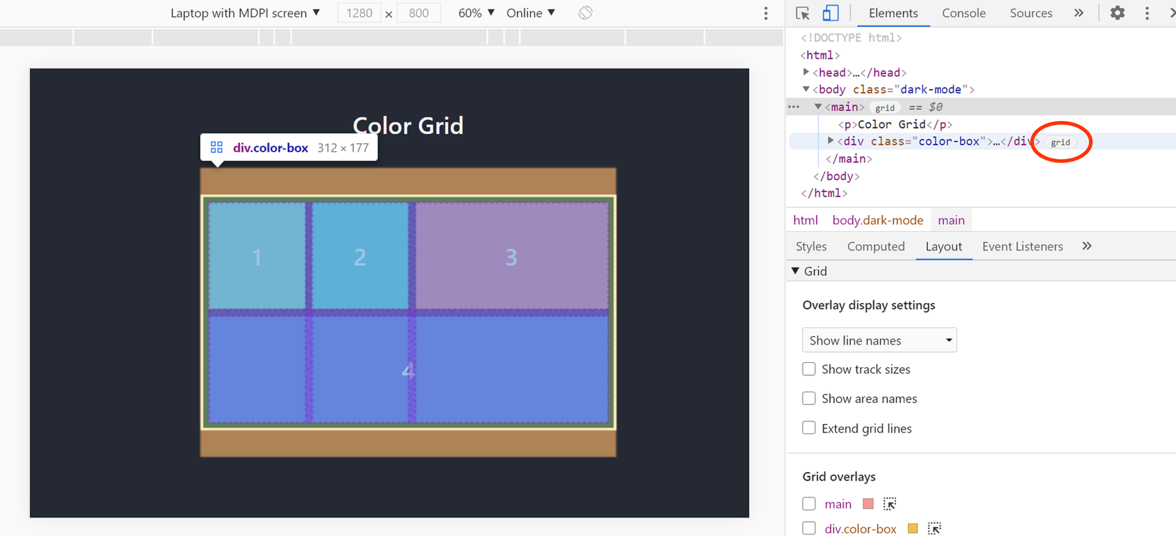 Bắt đầu với Grid debugging. Khi áp dụng display: grid hoặc display: inline-grid cho một phần tử HTML, bạn có thể nhìn thấy huy hiệu grid bên cạnh phần tử trong bảng Elements. Nếu bạn di chuyển con trỏ chuột qua huy hiệu grid, bạn có thể thấy rằng một lớp phủ xuất hiện trên phần tử, giống như một lưới để hiển thị vị trí của các đường lưới và viền của nó