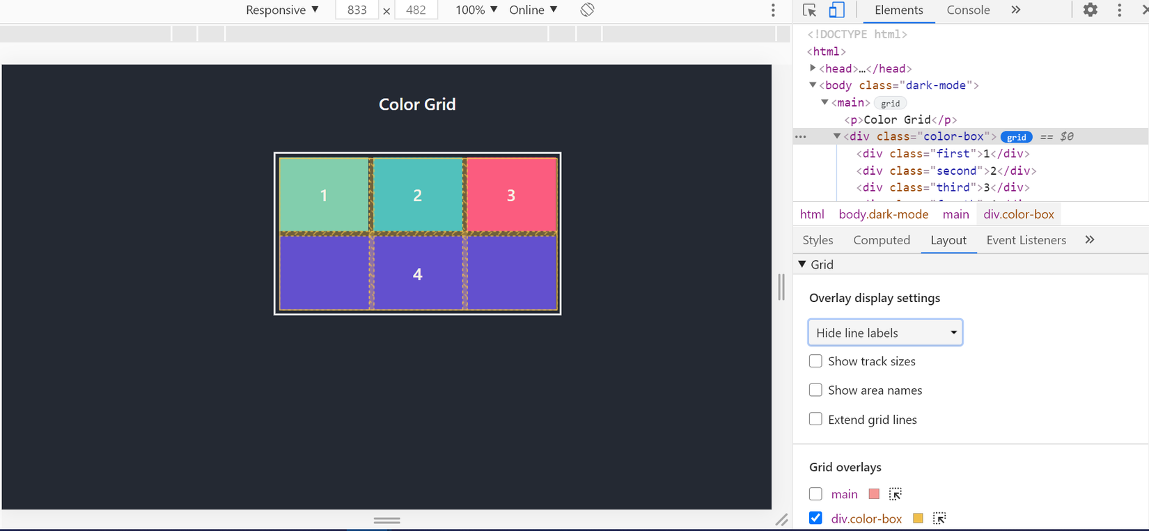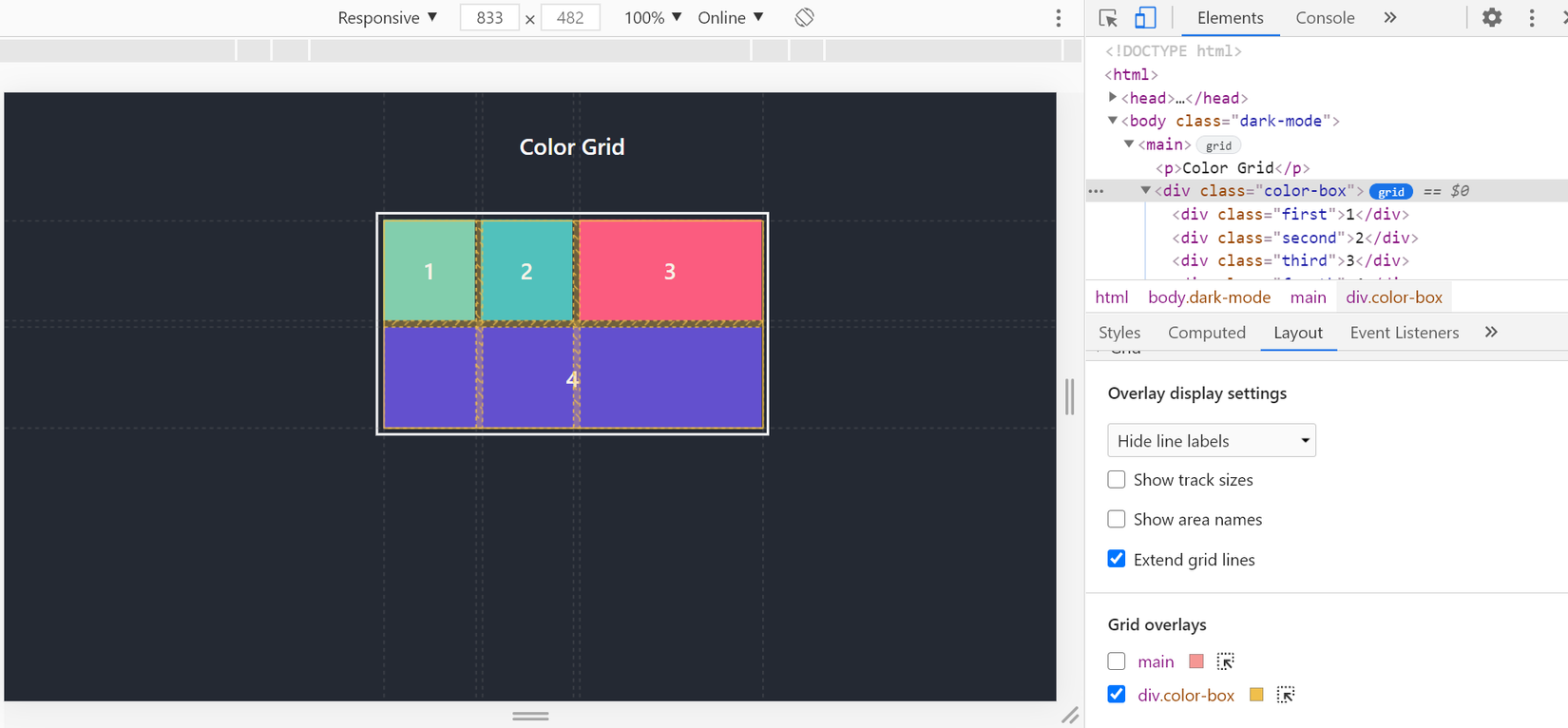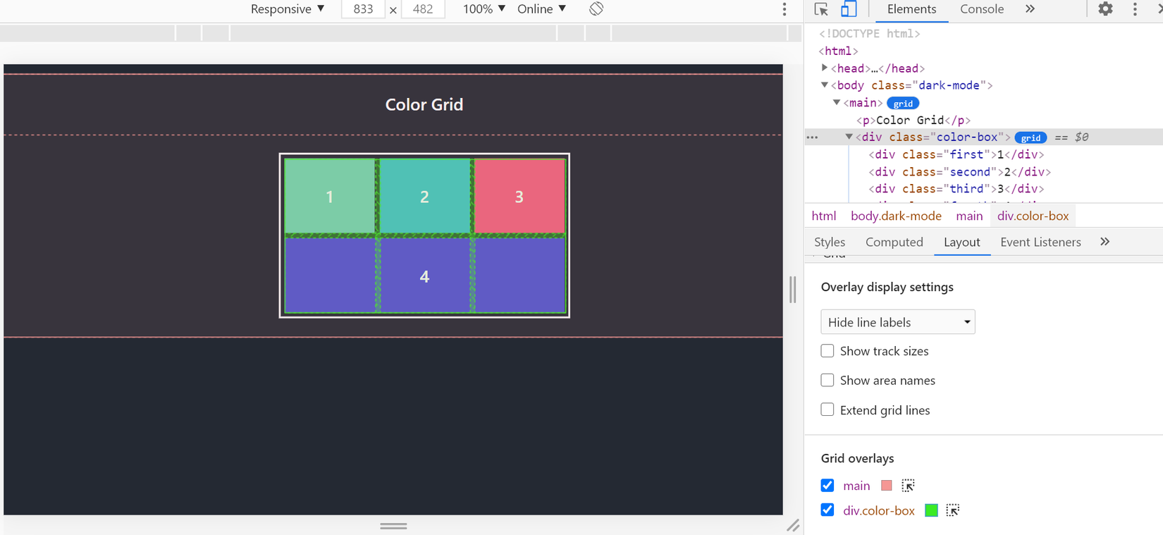Bắt đầu với Grid debugging. Khi áp dụng display: grid hoặc display: inline-grid cho một phần tử HTML, bạn có thể nhìn thấy huy hiệu grid bên cạnh phần tử trong bảng Elements. Nếu bạn di chuyển con trỏ chuột qua huy hiệu grid, bạn có thể thấy rằng một lớp phủ xuất hiện trên phần tử, giống như một lưới để hiển thị vị trí của các đường lưới và viền của nó