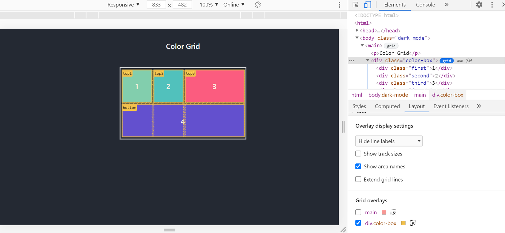 Bạn có thể chuyển đổi để hiển thị hoặc ẩn tên khu vực, trong ví dụ này các khu vực lưới được đặt tên. Như bạn có thể thấy trong ví dụ sau, có bốn vùng trong Grid - top1, top2, top3 và bottom