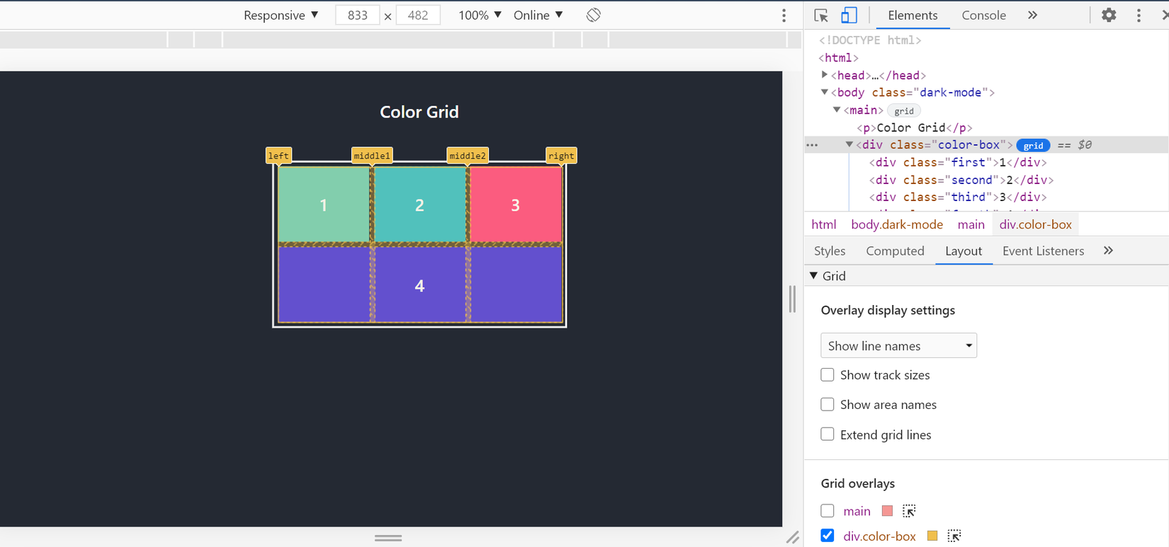 Hiển thị tên dòng giúp dễ dàng hình dung vị trí đầu và cuối của một phần tử. Như bạn có thể thấy trong ví dụ trên, có bốn dòng: left, middle1, middle2 và right. Hơn nữa, phần tử được đánh số theo thứ tự từ trái sang phải