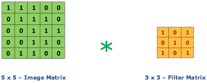 Xem xét 1 ma trận 5 x 5 có giá trị pixel là 0 và 1. Ma trận bộ lọc 3 x 3 như hình bên dưới.