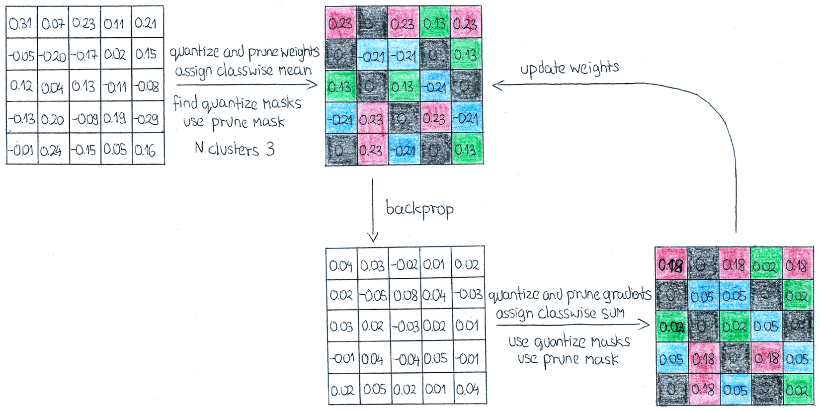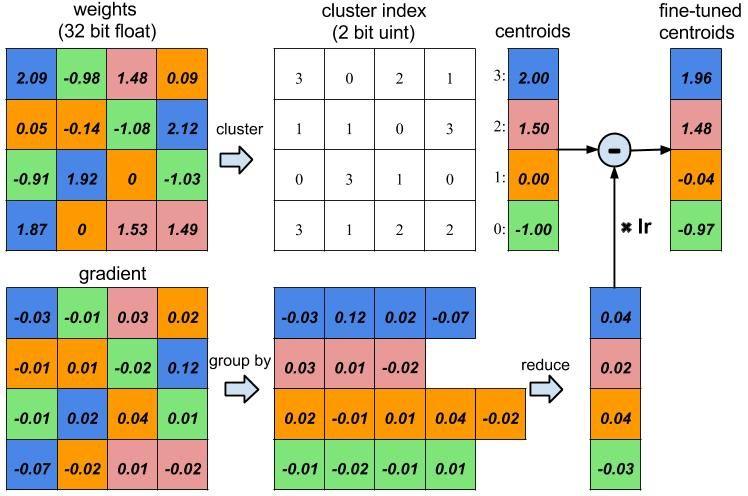 Đầu tiên ta cần tìm ra các điểm là trung tâm (centroid) của các cụm này, và các mask chỉ số biểu thị cho các các phần tử ma trận thuộc về từng class, số lượng các mask sẽ tương tự với số centroid và số lượng clusters. Để tìm được giá trị centroid, các cluster_mask tốt nhất, ta thực hiện 1 số vòng lặp nhất định , với mỗi vòng lặp tính toán khoảng cách từ centroid đến từng điểm weight của matrix weight, cluster mask tương ứng sẽ là các vị trí mà tại đó giá trị khoảng cách là nhỏ nhất. Sau mỗi lần lặp, giá trị centroid của từng cluster cũng sẽ được cập nhật lại bằng trung bình các giá trị weight được assign cho mỗi cluster (dựa vào cluster mask, ta sẽ biết được đâu là điểm được assign). Cuối cùng sau khi tìm được các giá trị tối ưu, ta thực hiện việc update nó cho ma trận weight của layer.