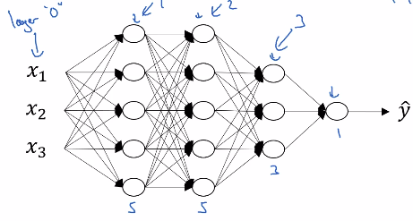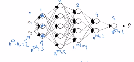Mạng lưới thần kinh trên có số layer L = 5 với 4 hidden layer và 1 output layer. Số unit trong mỗi layer được thể hiện trên hình vẽ.