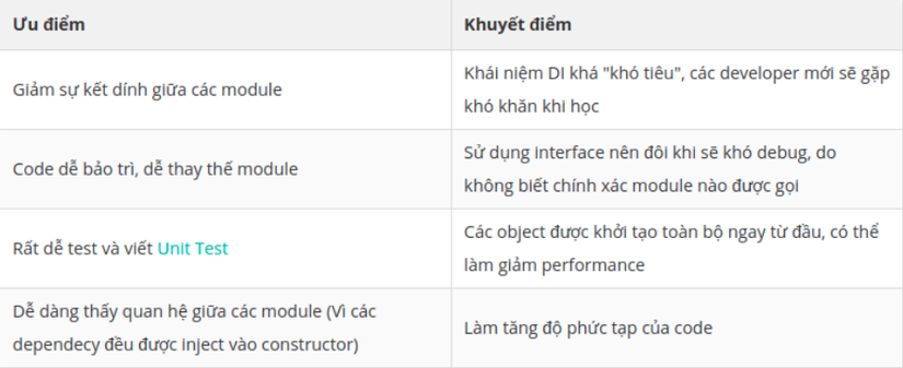 - Constructor Injection: Các dependency sẽ được container truyền vào (inject vào) 1 class thông qua constructor của class đó. Đây là cách thông dụng nhất.