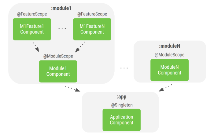 Ví dụ: Trong module login ta có thể có một LoginComponent có phạm vi với anotation @ModuleScope, nó cung cấp các đối tượng phổ biến cho tính năng đó, chẳn hạn như LoginRepository. Bên trong module đó ta cũng có thể có các thành phần khác phụ thuộc vào LoginComponent với phạm vi tùy chỉnh khác. Ví dụ @FeatureScope cho LoginActivityComponent hoặc một TermsAndConditionsComponent nơi ta có thể giới hạn nhiều logic đặc trưng hơn như đối tượng ViewModel