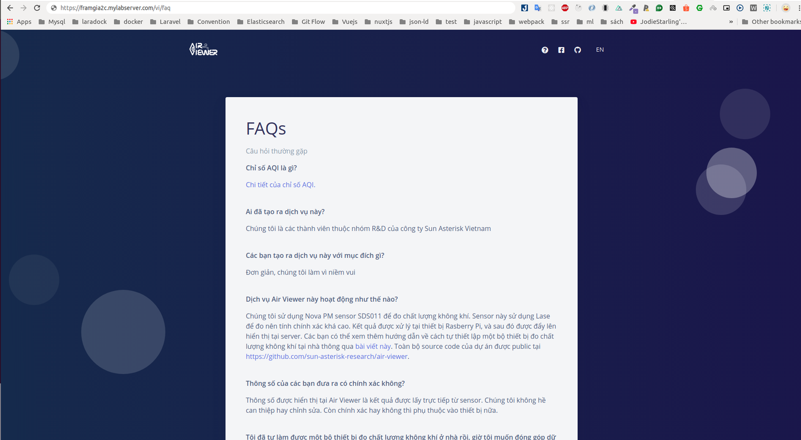 Hiện tại thì chúng ta chưa có client PI + sensor để thu thập dữ liệu không khí để gửi đến tên miền này, dữ liệu sẽ bị trống không được như trang http://airviewer.sun-asterisk.vn/