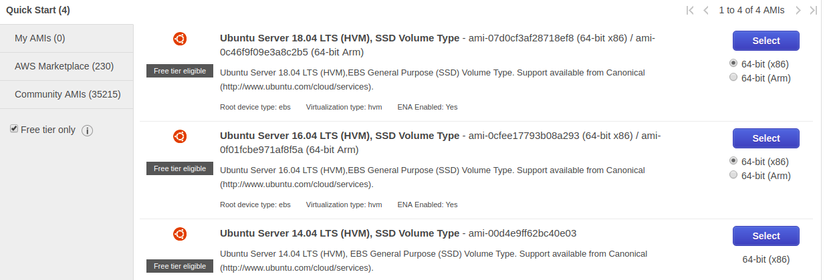 Chọn Launch instance và search từ khóa cho ubuntu và chọn ubuntu 16.04 nhé.