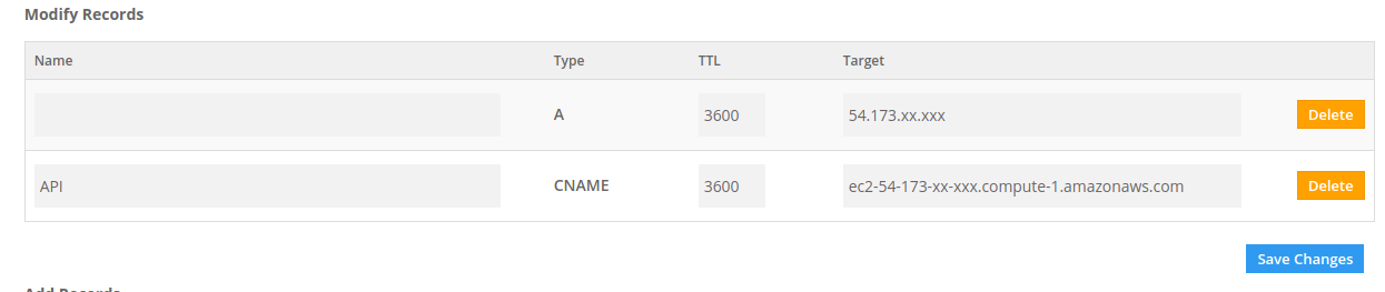 Trỏ đến ip của ec2 như hình dưới, trong đó ip và dns amazon là địa chỉ tương ứng của instance ec2 của bạn.