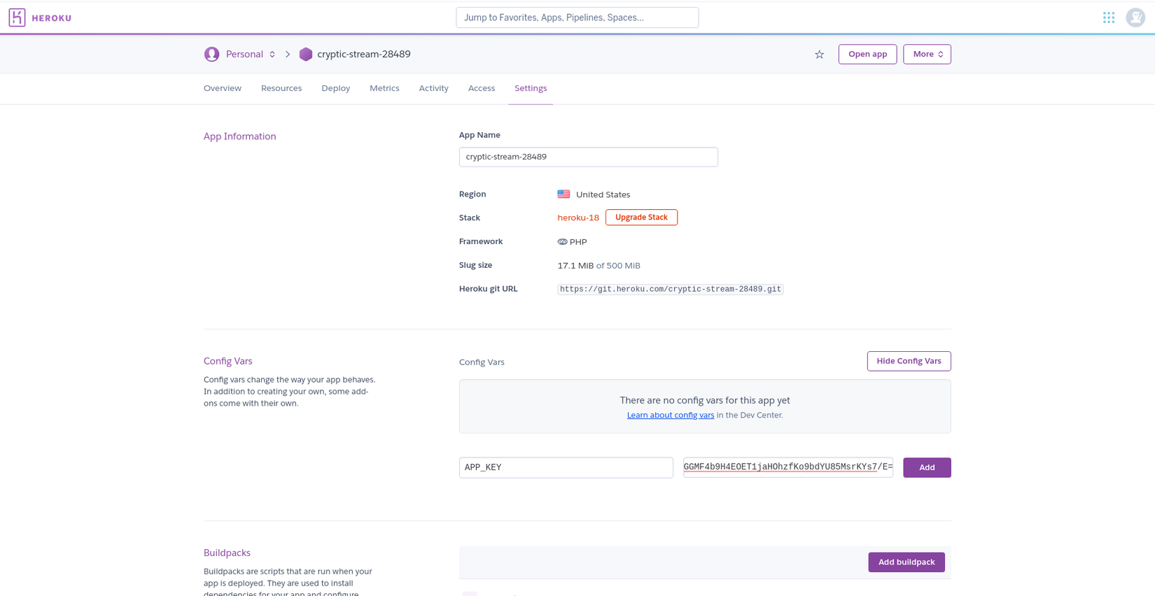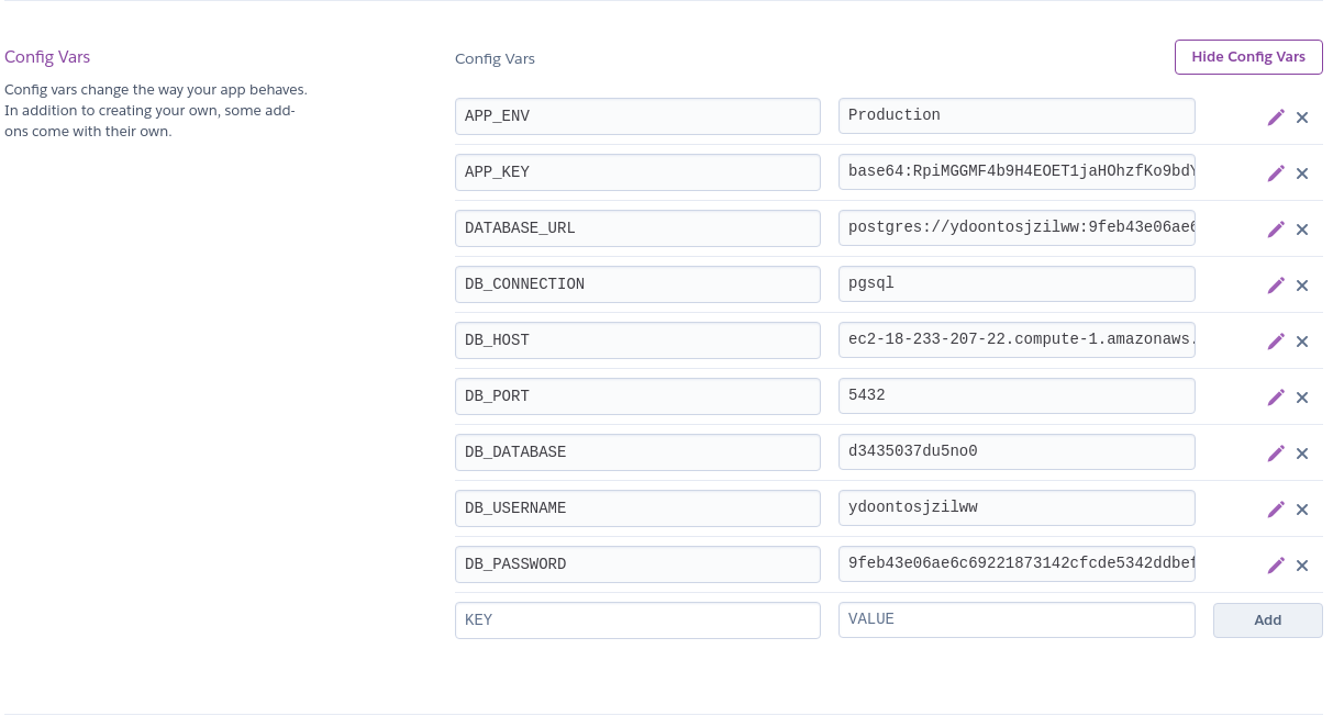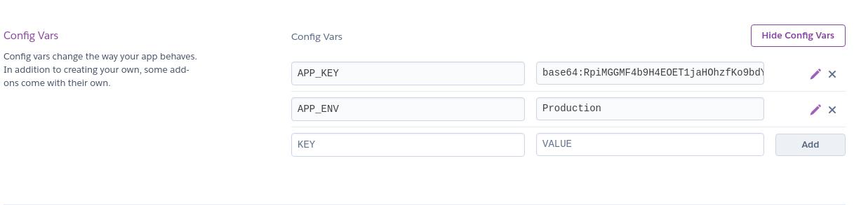 Phần này bạn có thể vào phần settings của app bạn vừa tạo trên Dashboard Heroku . Tạo phần Config Vars bạn thêm các key cho app Laravel