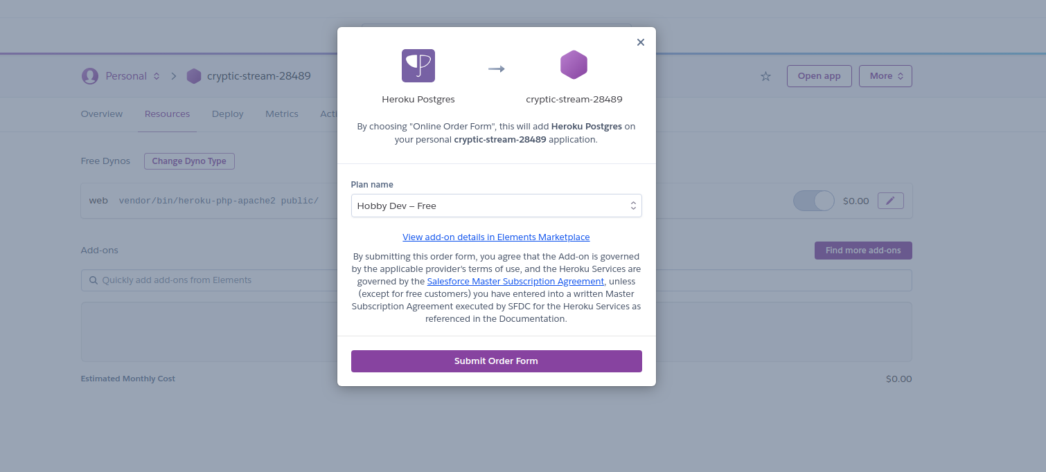 Tại phần resources, chúng ta tìm Heroku Postgres và thực hiện cài đặt vào app