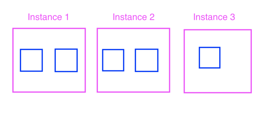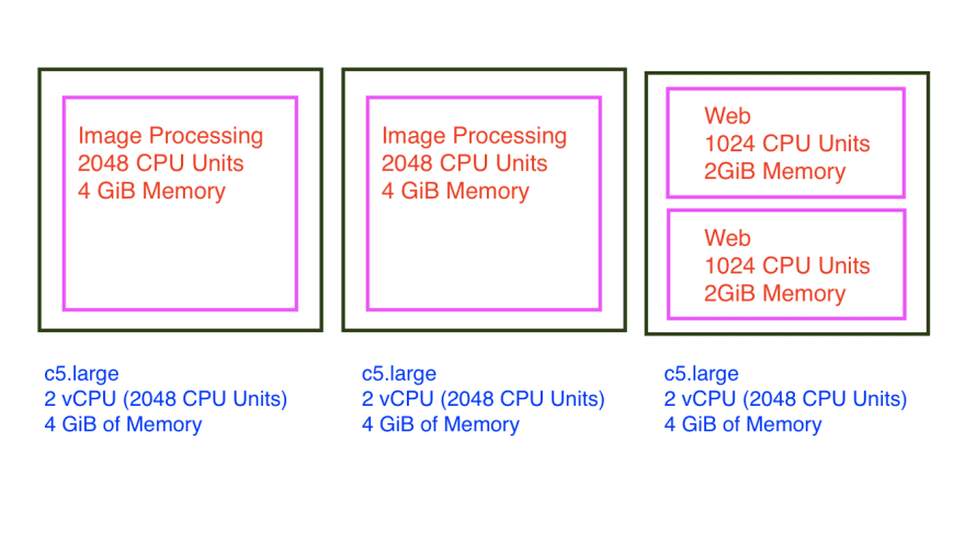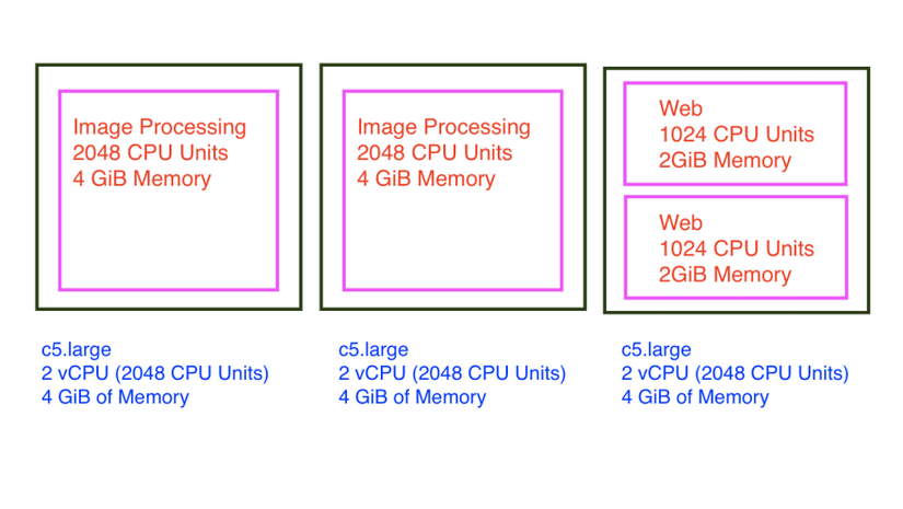 Giả sử web service của chúng ta cần 1.024 CPU units và 2GB RAM đối với 1 task, và service xử lý ảnh cần tới 2.048 CPU units và 4GB RAM cho 1 task, thì chúng ta có thể đưa vào 2 image processing tasks và 2 web service tasks vào trong 3 c5.large instance này. Nếu chúng ta muốn đưa thềm vào 1 web service task nữa, điều này là không thể vì toàn bộ tài nguyên của 3 c5.large instance đã được phân bố đầy đủ cho 4 task trước đó.