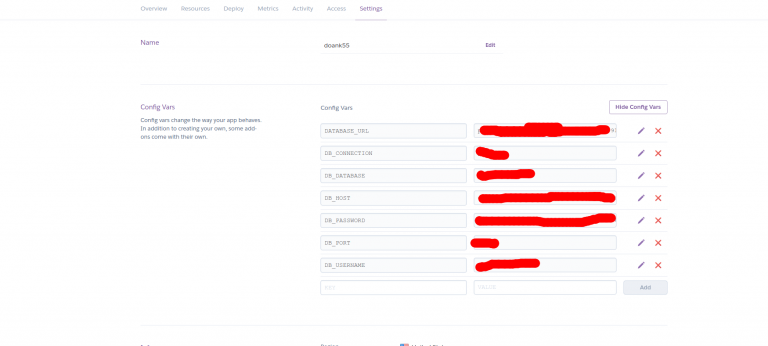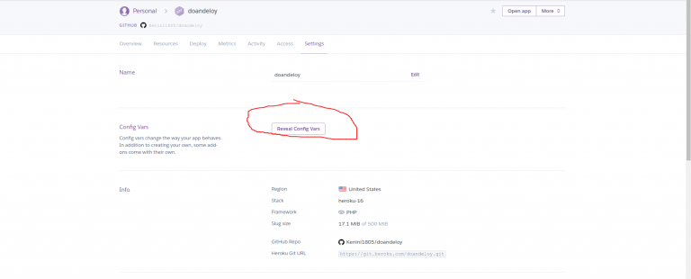 Sau khi lấy được thông tin bạn chuyển lại trang dashboard vào thư mục setting và click vào Reveal Config Vars