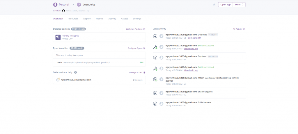 Sau đó ta chọn tên app của mình còn phần Choose a region sẽ để mặc định và ấn Create app. Sau khi tạo app thành công, Heroku sẽ tự động redirect bạn về trang quản trị của app đó.